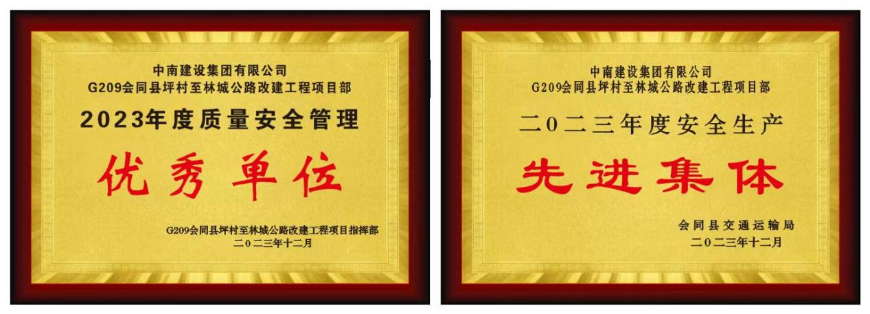 今年,集團公司承建的G209會同縣坪村至林城公路改建工程喜獲會同縣發(fā)改委頒發(fā)的“2023年度清廉工程”獎、懷化市平安辦頒發(fā)的“2023年度平安工地”、懷化市交通局頒發(fā)的“2023年度和諧工地”、會同縣交通局頒發(fā)的“2023年度安全生產(chǎn)先進集體”等多項榮譽與獎項。