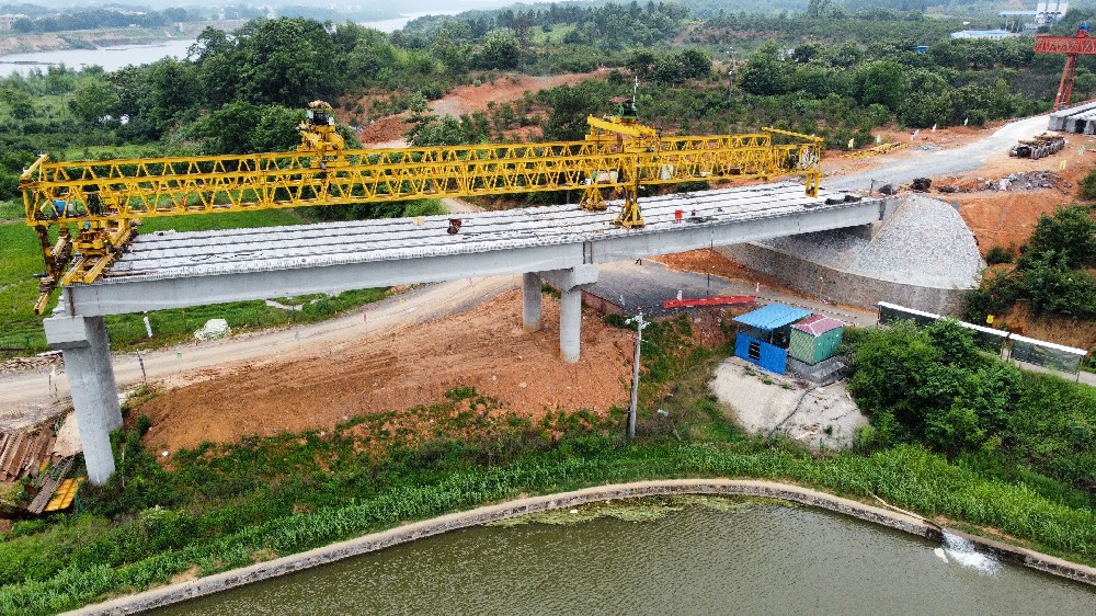中南建設(shè)集團(tuán)耒陽(yáng)市大河邊渡改橋工程首片預(yù)制T梁成功架設(shè)