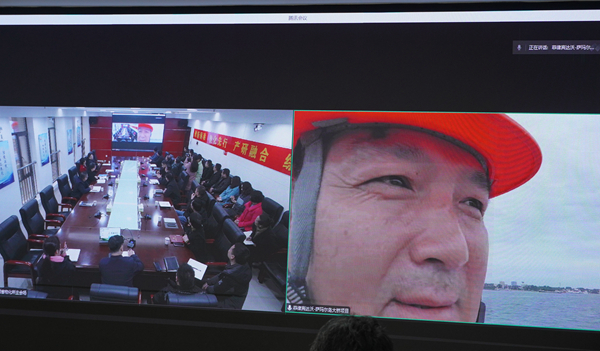 談文勝一行率先抵達(dá)物化所,在座談會現(xiàn)場,談文勝與在菲律賓達(dá)沃-薩瑪爾跨海大橋樁基項(xiàng)目部的工作人員進(jìn)行視頻連線,親切交談。