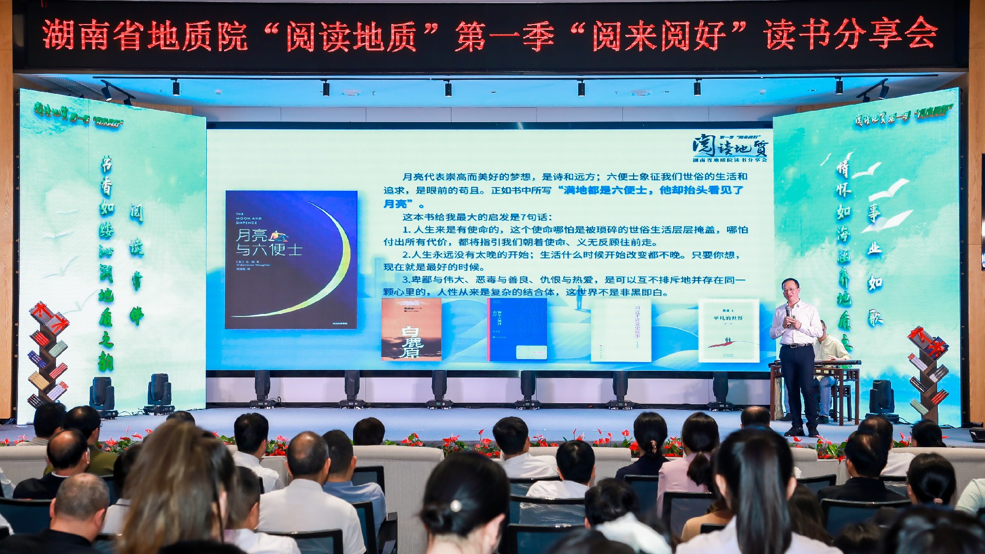 “腳步夠不到的地方,書籍可以;眼睛看不到的地方,書籍可以”“《習(xí)近平講黨史故事》是2023年3月我在中央黨校學(xué)習(xí)期間讀完的,我還從‘銘記一輩子、回味一輩子、受益一輩子、激勵一輩子、奮進(jìn)一輩子’在中央黨校讀書分享會上談了感受”“《月亮與六便士》是我這次到深圳出差期間讀完的,起初我不理解書名,直到看完書才深刻領(lǐng)會其中旨意”……現(xiàn)場,伴著古琴聲聲,談文勝以“讓閱讀點(diǎn)亮地質(zhì)未來”為題,結(jié)合自身讀書經(jīng)歷和所感所悟,為大家傾情推薦五本書;并從不求完美的閱讀場景、不求完好的閱讀體驗(yàn)、不求完滿的閱讀結(jié)果、不求完整的閱讀體系等方面,勉勵全院干部職工學(xué)習(xí)習(xí)近平總書記“一物不知,深以為恥,便求知若渴”的讀書態(tài)度,珍惜閱讀機(jī)會,用心感受書籍帶來的智慧與力量。