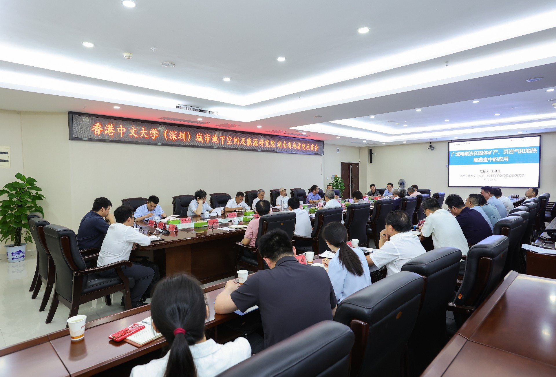 座談會(huì)上,雙方互相介紹了單位基本概況、改革發(fā)展、人才隊(duì)伍建設(shè)、科研成果及平臺(tái)、對(duì)外合作、海外地質(zhì)、典型項(xiàng)目等情況。香港中文大學(xué)(深圳)城市地下空間及能源研究院5位專家學(xué)者分別圍繞廣域電磁法在固體礦產(chǎn)、頁巖氣和地?zé)崮芸辈橹械膽?yīng)用,新型地球物理探測(cè)裝備商業(yè)化推廣應(yīng)用,湖南省中深層地?zé)崮苓x區(qū)與評(píng)價(jià)建議,湖南省煤系氣及伴生綠色能源地質(zhì)選區(qū)與資源評(píng)價(jià),煤地下原位氣化(制氫)及碳封存技術(shù)等課題進(jìn)行了學(xué)術(shù)交流。雙方就發(fā)揮各自優(yōu)勢(shì),在數(shù)字地質(zhì)建設(shè)、堤壩管涌隱患檢測(cè)、城市地下空間、設(shè)備升級(jí)改造、中深層地?zé)崮芸碧介_發(fā)與利用、地質(zhì)研究與工程一體化、人才交流培養(yǎng)、打造科研團(tuán)隊(duì)、建立產(chǎn)學(xué)研用及長(zhǎng)期合作機(jī)制等方面探討了契合點(diǎn)并達(dá)成合作共識(shí)。
