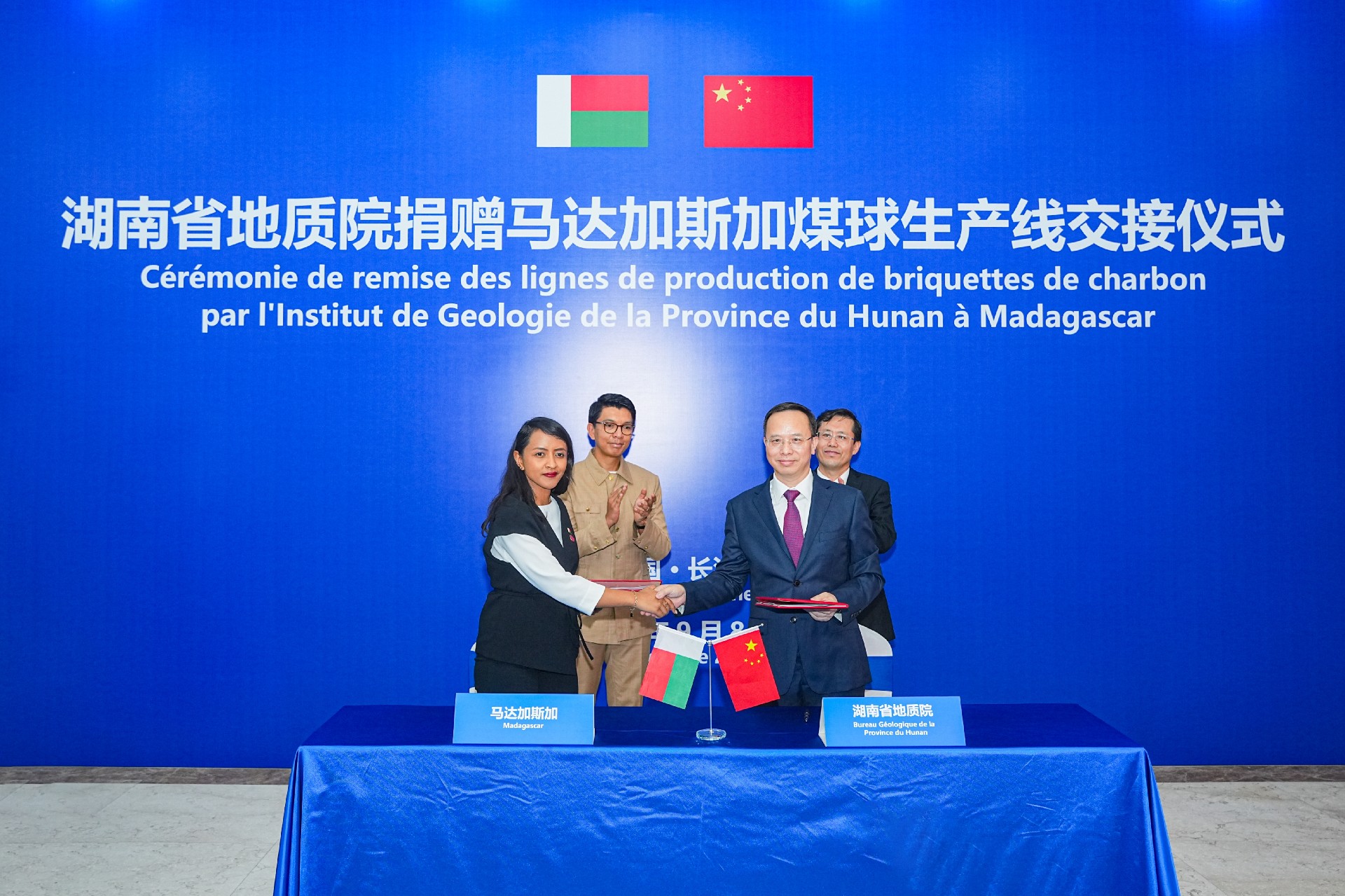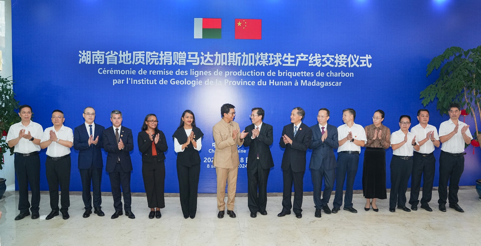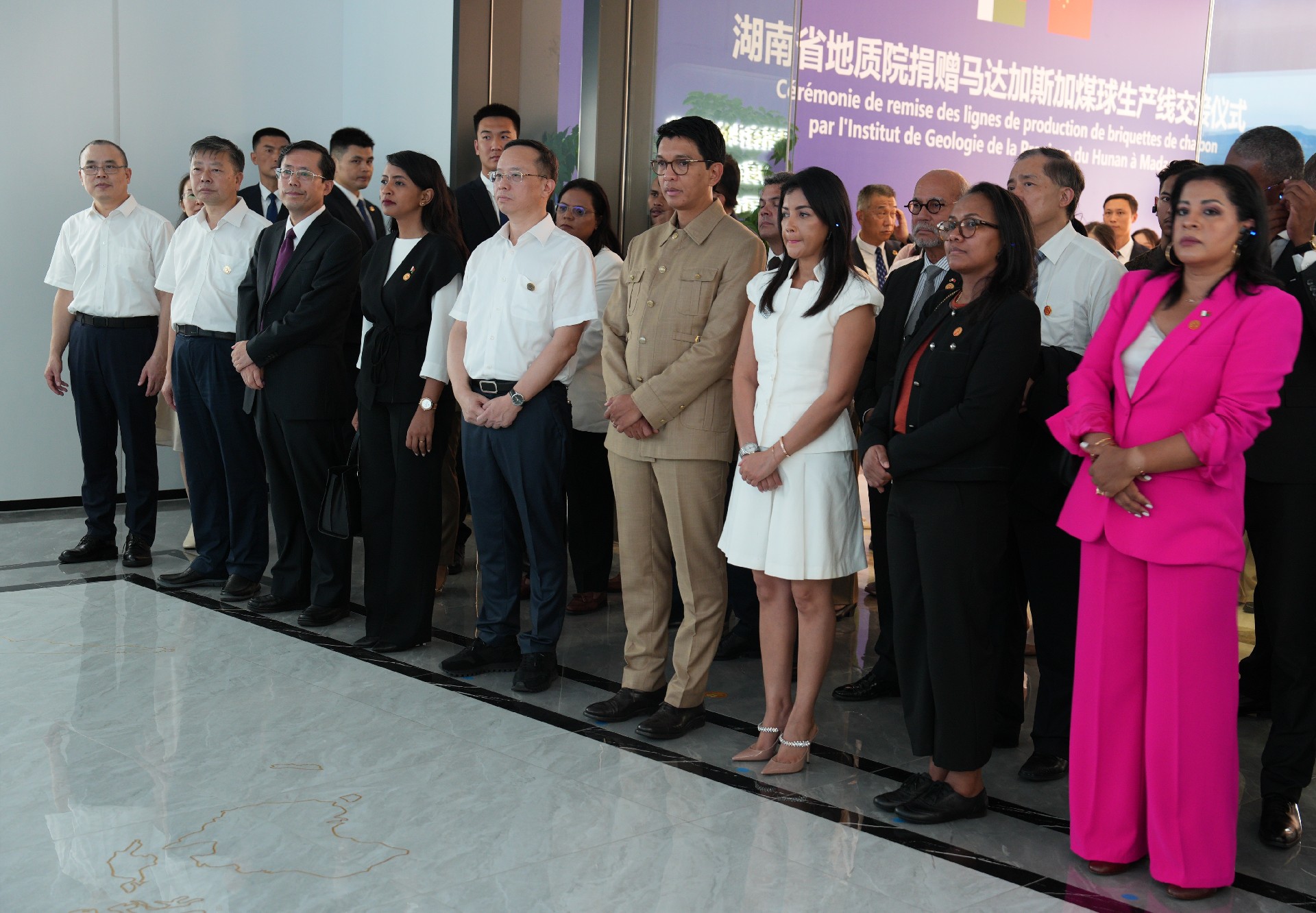 9月8日下午,來華出席中非合作論壇北京峰會的拉喬利納總統(tǒng)來到湖南省地質院、湖南省地質實驗測試中心考察地質科研情況并出席湖南省地質院捐贈馬達加斯加煤壓球生產線交接儀式。