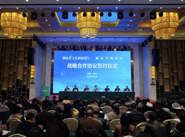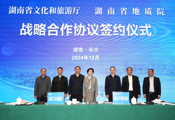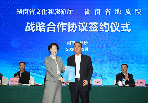 談文勝指出,地質(zhì)和文旅有著天然聯(lián)系,地質(zhì)景觀和地質(zhì)遺跡是自然景觀的重要組成部分,地質(zhì)要素是文旅產(chǎn)業(yè)發(fā)展的“本底”。省地質(zhì)院立足職能定位和特色優(yōu)勢,在發(fā)掘優(yōu)質(zhì)旅游資源、打造世界和國家地質(zhì)公園、建設(shè)地質(zhì)文化村(鎮(zhèn))、旅游景區(qū)地災(zāi)預(yù)警排查等方面做了一大批基礎(chǔ)性服務(wù)性工作,探索出了一條應(yīng)用“地質(zhì)+”模式助力“文旅富民”的道路,以實(shí)際行動彰顯了地質(zhì)之為、地質(zhì)所能。雙方正式簽訂戰(zhàn)略合作協(xié)議,文化旅游發(fā)展與地質(zhì)技術(shù)支撐“雙向奔赴”,既是雙方面向未來的“再出發(fā)”,更是志同道合的“再聯(lián)手”。就深化雙方的戰(zhàn)略合作,他提出三點(diǎn)期盼:一要同向發(fā)力塑品牌。省文旅廳與省地質(zhì)院將雙方優(yōu)勢有機(jī)結(jié)合,圍繞合作內(nèi)容,采取務(wù)實(shí)有效措施,轉(zhuǎn)化資源為文旅魅力,打造知名湖南文旅品牌。二要深度融合拓空間。要以資源合理開發(fā)利用為核心,深化雙方在多領(lǐng)域的合作,創(chuàng)新合作模式與舉措,推動合作邁上新臺階。三要科技創(chuàng)新建高地。融合地質(zhì)與地理信息數(shù)據(jù),利用“地質(zhì)云”和“實(shí)景三維”,賦能湖南文旅,延長產(chǎn)業(yè)鏈,提高附加值,開發(fā)湖湘特色文旅新模式。