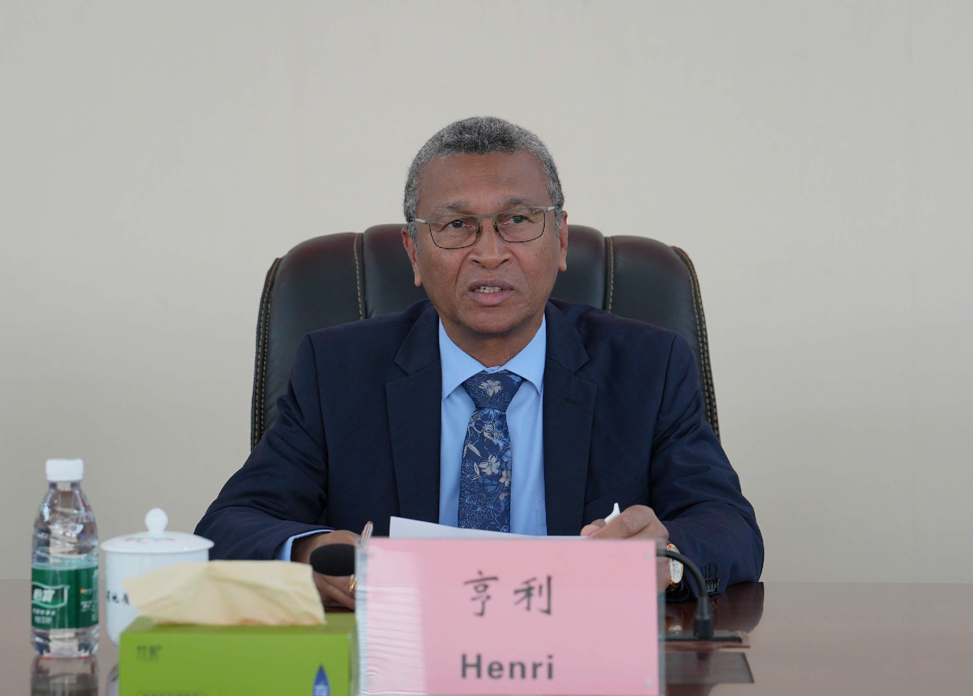 談文勝對(duì)亨利的到訪表示歡迎,并介紹了近年來湖南地質(zhì)在非洲取得的一系列找礦成果。他指出,中馬兩國友誼深厚、合作基礎(chǔ)堅(jiān)實(shí),近年來馬達(dá)加斯加礦業(yè)部與省地質(zhì)院頻繁互訪,加深了雙方友好關(guān)系。在馬達(dá)加斯加設(shè)立湖南地質(zhì)非洲工作站是基于對(duì)整體環(huán)境的深刻洞察、基礎(chǔ)條件的充分考量以及“走出去”戰(zhàn)略的現(xiàn)實(shí)需求而作出的決定。馬達(dá)加斯加礦產(chǎn)資源豐富,勘查需求迫切,湖南地質(zhì)已在馬實(shí)施多個(gè)項(xiàng)目,有雄厚技術(shù)實(shí)力和豐富經(jīng)驗(yàn),特別是今年4月建成的馬達(dá)加斯加湖南地質(zhì)檢測(cè)實(shí)驗(yàn)室,目前可檢測(cè)30多種礦物質(zhì),為非洲礦產(chǎn)資源勘查與開發(fā)提供了強(qiáng)有力的技術(shù)支持。他強(qiáng)調(diào),開放合作是響應(yīng)省委、省政府“搭船出海、借梯上樓”號(hào)召的有力實(shí)踐,也是院“一體兩翼三支撐”發(fā)展戰(zhàn)略的組成部分,要把湖南地質(zhì)非洲工作站打造成輻射整個(gè)非洲的重要平臺(tái),樹立湘馬合作的典范,成為中非合作的標(biāo)志性項(xiàng)目,推動(dòng)中非關(guān)系向更高層次、更廣領(lǐng)域發(fā)展,為構(gòu)建中非命運(yùn)共同體貢獻(xiàn)地質(zhì)智慧與力量。
